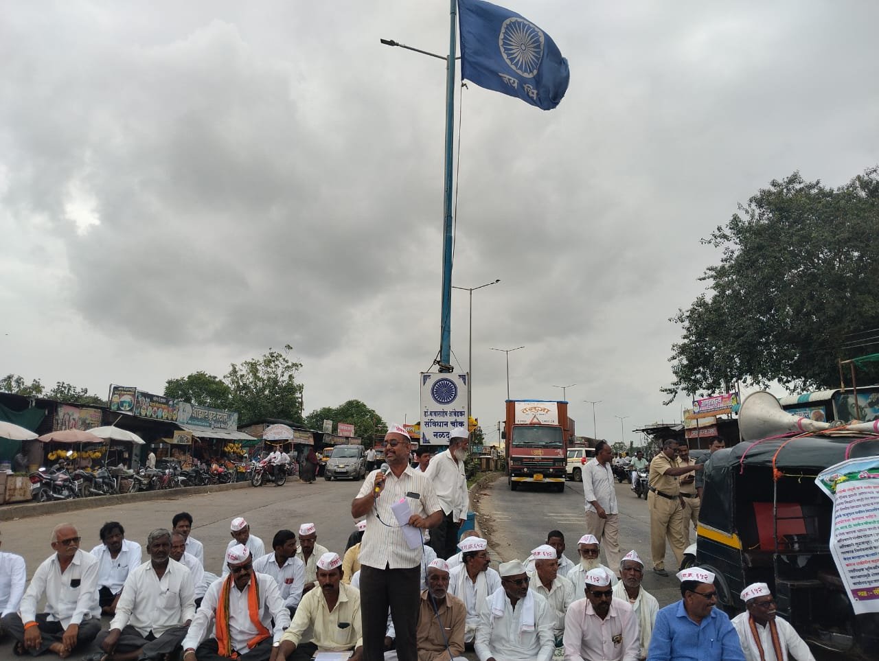शेतकरी संघर्ष समितीचे नेते सरदारसिंग ठाकूर, दिलीप जोशी यांच्या प्रमुख नेतित्वाखाली नळदुर्ग येथे राष्ट्रीय महामार्गावर बस स्थानकांच्या समोर डॉ. बाबासाहेब आंबेडकर संविधान चौकात शेतकऱ्याना कर्ज माफी द्यावी, सन – २०२०-२०२१ चा पिक विमा वाटप करावा, उसाचे थकीत बिल द्यावे,शेतकऱ्यावर पोलीस बळाचा वापार करून अन्याय करणाऱ्या पोलीस कर्मचार्यावर कारवाई करावी, शेतकरी अनुदानाचे वाटप करावे आदीसह विविध जिव्हाळ्याच्या मागण्यासाठी दि.८ जुलै २o२५ रोजी सकाळी ठिक ११ वा.”कर्ज माफ़ी मिळालीचं पाहीजे”,”शेती आमच्या हक्काची नाही कोणाच्या बापाची” असा घोषणा देत शेतकरी संघर्ष समितीच्या वतीने नळदुर्ग बसस्थानका समोर राष्ट्रीय महामार्ग क्रमांक ६५ वर रास्ता रोको आंदोलन करण्यात आले. या प्रसंगी बोलताना शेतकरी संघर्ष समितीचे नेते दिलीप जोशी यानी वरिल प्रश्र उपस्थित केला.