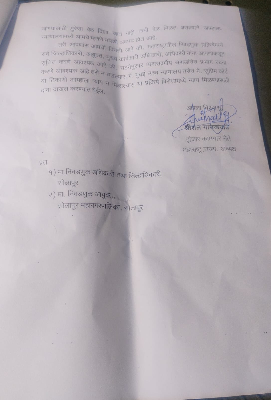 या विषयावर वंचित बहुजन आघाडीचे सोलापूर जिल्हा माजी अध्यक्ष श्रीशैल गायकवाड साहेब यांनी राज्य निवडणूक आयोग यांची भेट घेऊन निवेदन दिले आहे.
