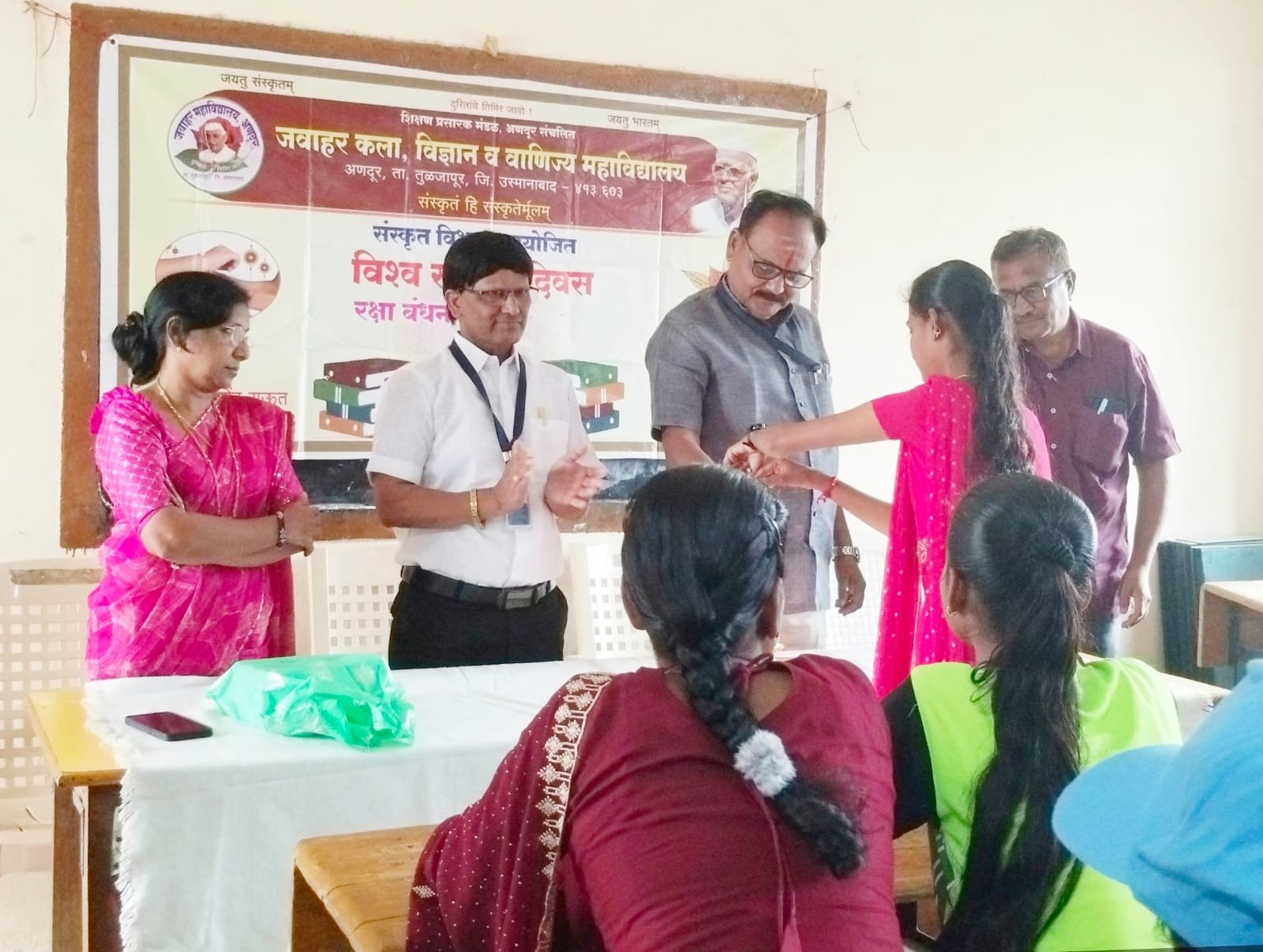 अणदूर येथील जवाहर महाविद्यालयातील संस्कृत विभागाच्यावतीने संस्कृत विभाग प्रमुख प्रा.डॉ.सत्येंद्र राऊत यांच्या पुढाकारातून शनिवार दि. ९ ऑगस्ट रोजी रक्षाबंधनाचा कार्यक्रम मोठ्या उत्साहात संपन्न झाला. या कार्यक्रमाच्या प्रास्ताविकात प्रा.सत्येंद्र राऊत संस्कृत भाषा व रक्षाबंधनाचे भारतीय संस्कृतीत खूप मोठे स्थान असून हा सण भारतातच नव्हे तर संपूर्ण जगात मोठ्या उत्साहाने साजरा केला जातो असे सांगितले. यानंतर कु. शीतल नरे हिने रक्षाबंधन हा सण कसा पवित्र व प्रेमाचा आहे, हे सांगून सर्वांना रक्षाबंधनाच्या शुभेच्छा दिल्या. महाविद्यालयाचे प्राचार्य डॉ. उमाकांत चनशेट्टी सरांनी यावेळी विद्यार्थ्यांना मार्गदर्शन केले. प्रमुख उपस्थिती म्हणून प्रा.डॉ. अनिता मुदकण्णा यांनी प्रा. राऊत यांना राखी बांधून विद्यार्थ्यांना सविस्तर मार्गदर्शन केले. कु. लक्ष्मी शेवाळकर, कु. सुहाना पटेल, कु. खुशी गायकवाड, कु. अश्विनी गायकवाड, कु.प्रीती चंदनशिवे, कु. साक्षी चव्हाण यांनी प्राचार्य डॉ.उमाकांत चनशेट्टी, उपप्राचार्य डॉ. मल्लीनाथ लंगडे, कार्यक्रमाचे आयोजक प्रा. सत्येंद्र राऊत तसेच जवाहर करियर अकादमीचे समन्वयक डॉ. सिद्धेश्वर बाड सर यांना राख्या बांधल्या. त्यानंतर महाविद्यालयात अध्ययन करत असलेल्या सर्व विद्यार्थ्यांना मुलींच्या हस्ते राख्या बांधून मिठाई भरविण्यात आली. याप्रसंगी उपप्राचार्य डॉ. मल्लीनाथ लंगडे सर अध्यक्षीय भाषणात संस्कृत विषयाच्यावतीने प्रतिवर्षाप्रमाणे यावर्षीही महाविद्यालयात व पोलिस स्टेशनमध्ये रक्षाबंधनाचा हा सामाजिक उपक्रम घेऊन सामाजिक बांधिलकी जोपासण्याचे काम करत असतात सरांनी याप्रसंगी सर्वांना रक्षाबंधनाच्या शुभेच्छा देऊन हा सण प्रेम, बंधुत्व, विश्वास व एकतेचे प्रतीक आहे आणि प्रत्येक भावाने संकटाच्या वेळी बहिणीचे रक्षण करण्याचे आवाहन करुन महाभारतातील श्रीकृष्ण व द्रौपदीची उदाहरणे दिली. याप्रसंगी महाविद्यालयातील सर्व विद्यार्थी,प्राध्यापक वृंद आणि शिक्षकेतर कर्मचारी तसेच बहुसंख्येने विद्यार्थी उपस्थित होते. कार्यक्रमासाठी प्रा.सत्येंद्र राऊत आणि संस्कृत विषयाच्या विद्यार्थ्यांनी अधिक परिश्रम घेतले. कार्यक्रमाचे सूत्रसंचालन कु.खुशी गायकवाड व आभार प्रदर्शन कु. साक्षी चव्हाण हिने केले.