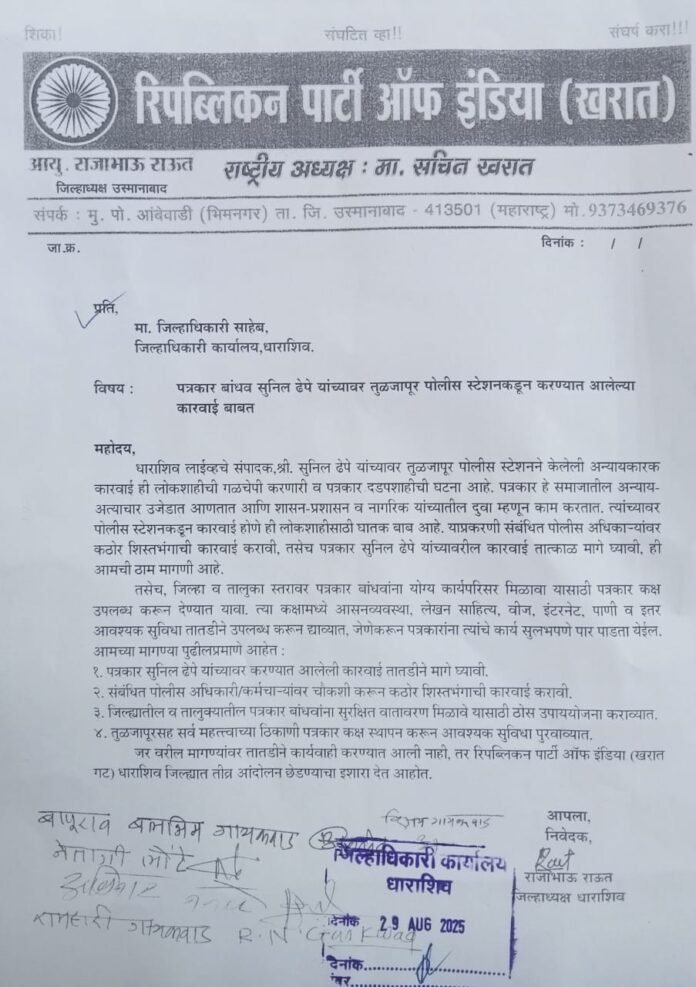 पत्रकार बांधव हे समाजाचे चौथे स्तंभ असून त्यांच्यावर होणारे हल्ले लोकशाहीसाठी गंभीर धोक्याची घंटा आहेत. धाराशिव लाईव्हचे संपादक श्री. सुनिल ढेपे यांच्यावर तुळजापूर पोलीस स्टेशनने केलेली कारवाई ही पत्रकारितेचे गळचेपी करण्याचा उघड प्रयत्न असून त्यामागे पोलीस प्रशासनाचा मनमानी कारभार उघडकीस येतो, असा तीव्र संताप रिपब्लिकन पार्टी ऑफ इंडिया (खरात) यांनी व्यक्त केला आहे.