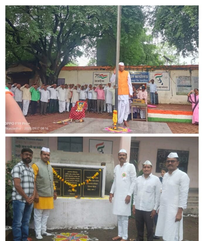 तुळजापूर तालुक्यातील जळकोट येथील जि. प. प्रशाला व ग्रामपंचायत कार्यालय जळकोट येथे मराठवाडा मुक्ती संग्राम दिनानिमित्त ध्वजारोहण कार्यक्रम मोठ्या उत्साहात साजरा करण्यात आला. प्रथमता जिल्हा परिषद प्रशाला येथे शालेय व्यवस्थापन समिती उपाध्यक्ष विजय पिसे यांच्या हस्ते सरदार वल्लभ भाई पटेल यांच्या प्रतिमेचे पुष्पहार घालून पूजन करण्यात आले.व ध्वजारोहण करून मानवंदना देण्यात आली. व त्यानंतर ग्रामपंचायत कार्यालय येथे यावेळी गावातील करांची बाकी भरलेल्या भाग्यवान कर दाते श्री काशिनाथराव व्यंकट कदम वाडीकर यांना तो ध्वजारोहण करण्याचा मान ग्रामपंचायत कार्यालयाकडून देण्यात आला. प्रथमता त्यांच्या हस्ते सरदार वल्लभाई पटेल यांच्या प्रतिमेचे पूजन पुष्पहार घालून करण्यात आले व काशिनाथराव कदम यांच्या हस्ते ध्वजारोहण करण्यात आले. व राष्ट्रगीत गायन करत ध्वजास मानवंदना देण्यात आली. यावेळी जळकोट गावचे सरपंच गजेंद्र कदम, माजी सरपंच अशोकराव भाऊ कदम, तंटामुक्ती अध्यक्ष यशवंत भाऊ कदम, ग्रामपंचायत सदस्य बसराज कवठे, कल्याणी साखरे, बसवराज कवठे, शिवाजी सुुुुरवसे, संतोष वाघमारे, नामदेव कागे, मेघराज किलजे , भैय्या किलजे, प्रशांत कारले,सुनील लोखंडे, नारायण पटणे, राजेंद्र कारले, माजी सैनिक भरत पाठक, तुकाराम कुंभार, मल्लिकार्जुन कुंभार, रुक्मुद्दीन तांबोळी, दिनकर कदम, जितेंद्र कदम, तसेच ग्रामपंचायत सदस्य, माजी सैनिक, अंगणवाडी सेविका मदतनीस, आशाताई, शिक्षकवृंद, पत्रकार बांधव, गावातील युवक ,नागरिक ग्रामस्थ मोठ्या संख्येने उपस्थित होते.