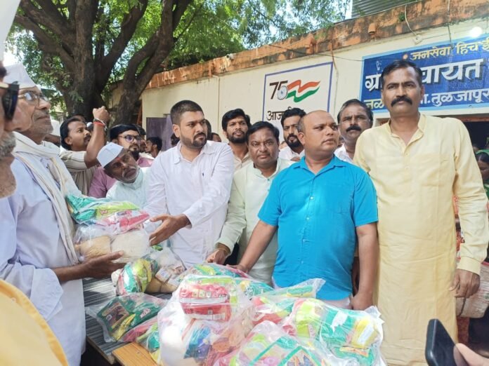 तुळजापूर तालुक्यातील जळकोट येथे पिंपरी चिंचवड महानगरपालिका भोसरी विधानसभेचे विद्यमान आमदार पै. महेश दादा लांडगे व दत्तात्रय (तात्या )परांडे, युवा नेतृत्व नगरसेवक उदय शेठ गायकवाड यांच्या संकल्पनेतून तुळजापूर तालुक्यातील जळकोट व परिसरातील यावर्षी झालेल्या अतिवृष्टी पावसामुळे शेतकऱ्यांचे अतोनात नुकसान झाले आहे. यामध्ये सर्व पिकांचे अतोनात नुकसान होऊन शेतकऱ्यावर मोठे संकट ओढवले आहे. व तसेच अनेकांच्या घरांमध्ये पाणी गेल्यामुळे घर संसार उध्वस्त झाले आहेत. अनेकांचे संसार रस्त्यावर आले आहेत. म्हणून यांना मदतीचा हात म्हणून घर उपयोगी संसार साहित्य व गहू ,तांदूळ, साखर ,शेंगदाणे व मसाल्याचे पदार्थ अशा जीवन आवश्यक खाण्याच्या पदार्थाचे 300 कीटचे वाटप करण्यात आले. या कीटचे वाटप जळकोट, जळकोटवाडी नळ, गणेश नगर, बोरमन तांडा, येथील व परिसरातील अतिवृष्टी भागातील लोकांना मदतीचा हात म्हणून या किटचे वाटप करण्यात आले .व तसेच जिल्हा परिषद प्राथमिक शाळेतील विद्यार्थ्यांना शालेय उपयोगी साहित्य 50 किटचे वाटप करण्यात आले. हे वाटप जळकोट येथील ग्रामपंचायत कार्यालयासमोर मान्यवरांच्या हस्ते या किटचे वाटप करण्यात आले. यावेळी जळकोट गावचे सरपंच गजेंद्र कदम, माजी सरपंच अशोक भाऊ कदम , डॉ. संजय कदम,बबन मोरे बसवराज भोगे, यांच्या हस्ते देण्यात आले. यावेळी योगेश अकुलवार, प्रमोद पठारे, जळकोट गावचे सामाजिक कार्यकर्ते मनोज कदम, गोरख गायकवाड, अमित महाडिक, करण निकम, निखिल पाटील, गणेश सावंत, नारायण वाळके, योगेश भालेराव, सुमित पटेल, प्रदीप तापकीर, तेजस वाळके, रोहन देसाई, राजेंद्र कदम, आकाश करांडे, संतोष पानसरे, किरण माळी ग्रामपंचायत सदस्य जीवन कुंभार, नागेश जाधव, नागनाथ कदम व गावातील नागरिक व महिला वर्ग मोठ्या संख्येने उपस्थित होता.