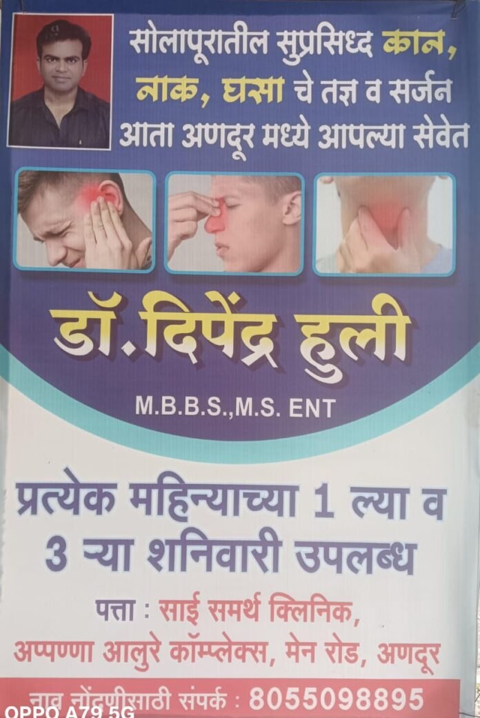 सोलापूरातील सुप्रसिद्ध कान, नाक, घसा तज्ञ व सर्जन डॉ. दिपेंद्र हुली अणदूरमध्ये सेवेसाठी उपलब्ध