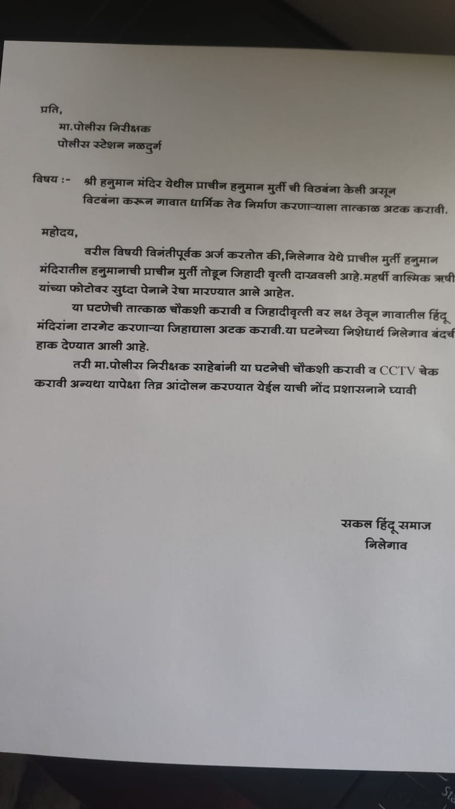 या पार्श्वभूमीवर सकल हिंदू समाज, निलेगाव यांच्या वतीने नळदुर्ग पोलीस स्टेशन येथे पोलीस निरीक्षकांना निवेदन देण्यात आले. या निवेदनामध्ये घटनेची तात्काळ सखोल चौकशी करून परिसरातील सीसीटीव्ही फुटेज तपासण्यात यावे आणि या प्रकारातील दोषींना लवकरात लवकर शोधून भारतीय दंड संहितेनुसार कठोर कारवाई करण्यात यावी, अशी ठाम मागणी करण्यात आली आहे.
