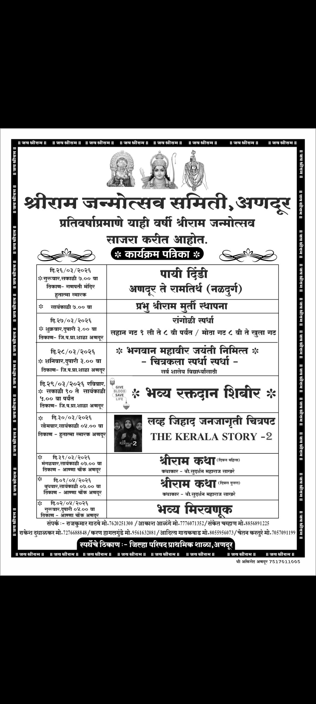 अणदूर (प्रतिनिधी) – श्रीराम जन्मोत्सवाच्या पावन निमित्ताने श्रीराम जन्मोत्सव समिती, अणदूर यांच्या वतीने समाजोपयोगी उपक्रम राबवत उद्या भव्य रक्तदान शिबिराचे आयोजन करण्यात आले आहे. मानवतेची सेवा आणि गरजू रुग्णांना जीवनदान देण्याच्या उद्देशाने आयोजित या शिबिराबाबत परिसरात उत्साहाचे वातावरण निर्माण झाले आहे.